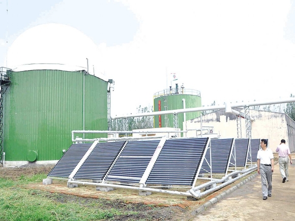 在上泊村的道路上,記者看到每隔100米就有分類垃圾箱,分為可回收和不可回收,每天能源站的垃圾回收車都會定時回收。而在位于村東的沼氣站現場,兩個巨大的沼氣罐十分醒目。“這是兩個容積為800方的沼氣一體化反應器,村里的生活垃圾、污水、畜禽糞便、蔬菜廢棄物全在里面發酵,每天最多能產生1000方的沼氣,足夠一個小鎮的住戶使用。”該村沼氣能源站負責人,青島天人環境有限公司的劉小姐說,沼渣、沼液用來培養大棚有機蔬菜和農作物,可提供當地高新農業示范園區2000座大棚蔬菜的用肥需求。