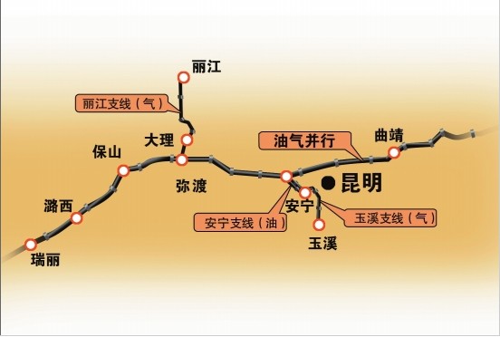 中緬油氣管道工程在云南省包括一干三支,油氣干線從瑞麗市入境后,自西向東并行鋪設(shè),經(jīng)過(guò)德宏州、保山市、大理州、楚雄州、昆明市、曲靖市,在富源縣的后所鎮(zhèn)進(jìn)入貴州盤縣。三條支線為安寧支線43公里輸油管、麗江支線201公里輸氣管線、玉溪支線106公里輸氣管線。