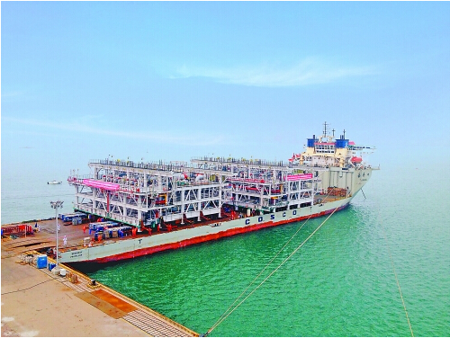 | 圖為完成裝船的亞馬爾MWP4包PAU111/211模塊。張?jiān)獫?攝 |