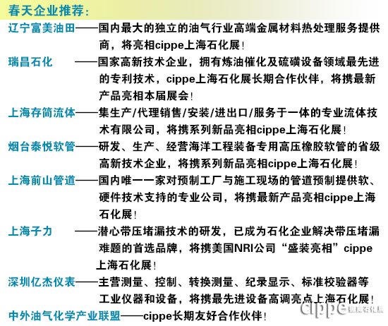石化行業一年一度的盛會,第八屆中國(上海)國際石油化工技術裝備展覽會(cippe上海石化展)將于8月23-25日在上海新國際博覽中心召開,經過八年的發展,cippe上海石化展已經發展成為一個溝通學習、合作貿易的首選平臺,被業內企業和專業人士視為石油化工行業內最高品質的展覽會之一。遼寧富美油田、瑞昌石化、上海存簡流體、煙臺泰悅軟管、上海前山管道、上海子力、深圳億杰儀表、中外油氣化學產業聯盟等煉化上下游企業將集體亮相本屆展會,共同探討煉化企業的未來發展方向。