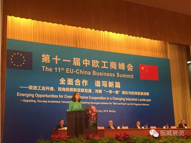 第十一屆中歐工商峰會由中國商務部、歐盟委員會主辦,中國國際貿易促進委員會、中國歐盟商會等機構聯合承辦。大會主題為:全面合作譜新篇——促進工業升級、雙向投資和互聯互通,對接“一帶一路”倡議與歐洲發展戰略。會議由中國貿促會會長姜增偉主持,中國歐盟商會主席伍德克、中國商務部部長高虎城、歐盟貿易委員馬爾姆斯特倫分別致辭,歐盟委員會主席容克發表演講。國家發改委主任徐紹史、工業和信息化部部長苗圩等相關部委領導到會。同時,由中國機械工業集團有限公司董事長任洪斌,歐洲雇主協會主席、意大利埃尼石油集團董事長馬切卡利亞,中國建筑材料集團有限公司董事長宋志平,羅蘭貝格國際管理咨詢有限公司首席執行官常博逸,TCL集團股份有限公司總裁薄連明,振威展覽股份董事長張學山等企業家組成的“豪華”中外參會陣容,亦頗受外界矚目。會上,與會人員圍繞“政策溝通——共同迎接新工業革命”、“資金融通——促進雙向融資”和“設施聯通——深化交通數字合作”三個分組議題展開了深入探討。