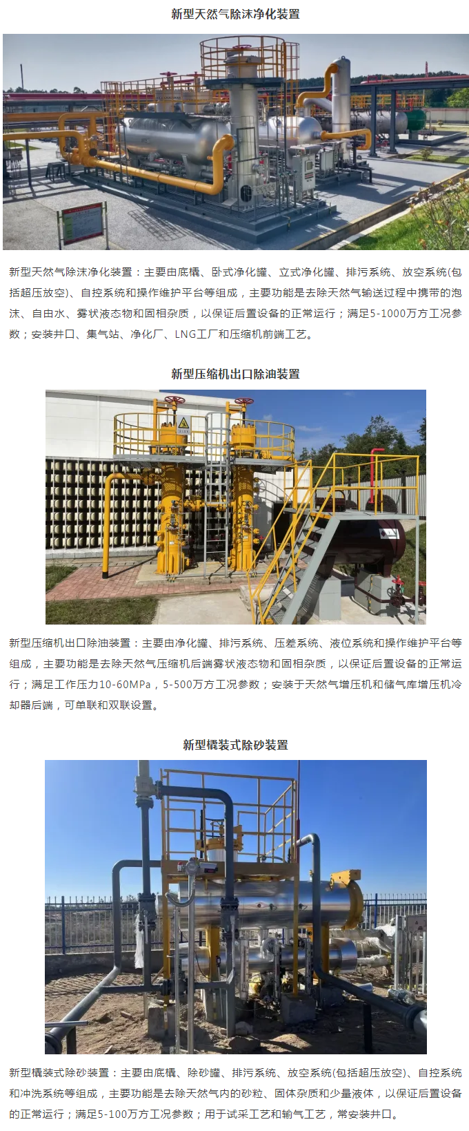 公司產品覆蓋石油、天然氣(頁巖氣、煤層氣)、化工等行業全產業鏈過濾、分離、凈化成套設備及過濾元件,核心產品有:新型煤層氣一體化凈化裝置、除油凈化裝置、橇裝除砂裝置、天然氣除沫凈化裝置、頁巖氣一體橇裝置、放空防噴濺裝置、儀表過濾凈化裝置、密閉連續供油裝置等。公司具備天然氣(頁巖氣、煤層氣)地面場站建設全產業鏈設備研發、生產能力(壓縮機制造除外),可滿足客戶從單一設備到整體工藝多樣化需求。