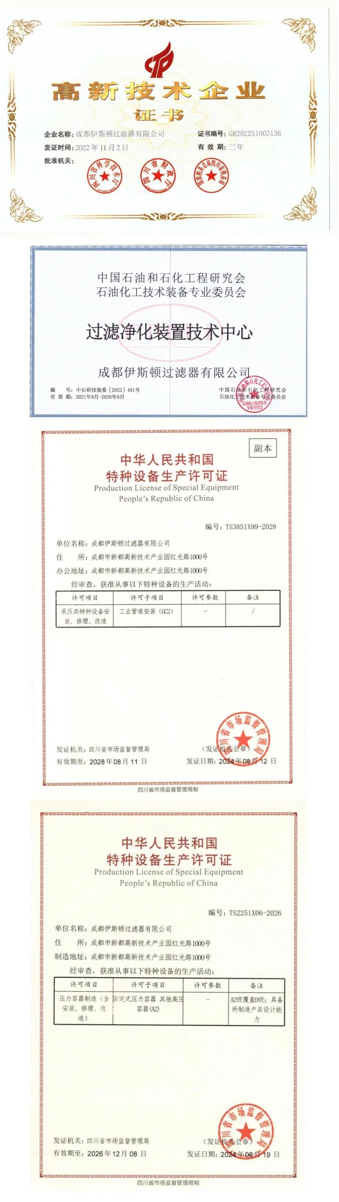 成都伊斯頓過濾器有限公司成立于2009年,是一家集研發、生產、銷售、服務為一體的專業從事過濾分離凈化產品的國家級高新技術企業、四川省專精特新企業,擁有A2級壓力容器制造和設計資質、GC2級管道安裝資質,并被中國石油和石化工程研究會認定為過濾凈化裝置技術中心,2025年公司已申請ASME認證、CNSA實驗室認定。
