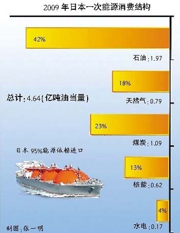 盡管日本一直大力推進新能源開發和利用,但石油在日本的一次能源消費結構中仍占主導地位。《BP能源統計2010》的數據顯示,石油在日本2009年能源消費構成中,仍然占約42.7%。