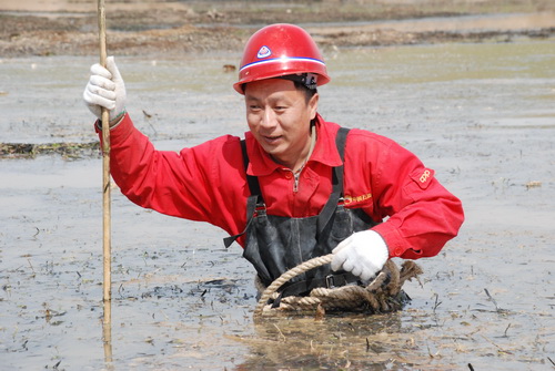 | 焊接機組電焊班長周平涉水測量河道。 |