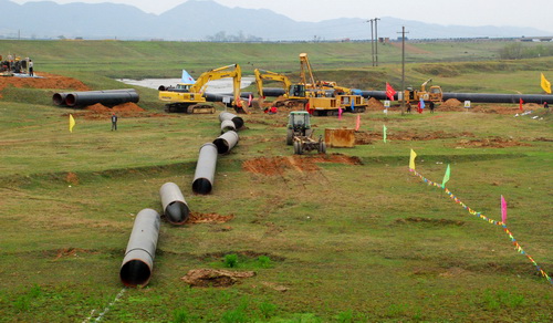 在河流大開挖施工中,管道三公司選派3個土方機組進行河道圍堰、開挖和倒土修路,當日僅土方機組就投入10臺挖掘機、50輛卡車和兩輛推土機,總共動用大型設備和車輛69臺套。