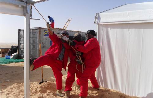 圖為施工中大港油建外籍員工在進(jìn)行營(yíng)地安裝。趙江華 攝 |