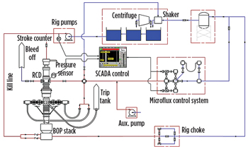 Weatherford’s closed-loop drilling system employs three key pieces of technology: an RCD, a drilling choke manifold and a coriolis flowmeter. Each of these elements can be used separately, and have been in the past, but Weatherford engineers David Pavel and Brian Grayson explained that it works much better when built as a complete system from the beginning, especially when grouped with their Microflux control system, Fig. 2.