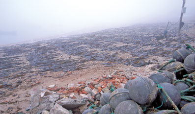 7月9日,大欽島附近海域一片霧氣。時值海帶收獲季節,大欽島無論碼頭、沙灘還是路邊,目之所及俱是漁民們收曬海帶的忙碌身影。小濠村漁民唐道恒既種海帶又養扇貝,六七月,他家的扇貝出現了死亡現象。唐道恒的妻子說,她想帶頭起訴中海油和康菲石油公司,但又無法提供證據。
