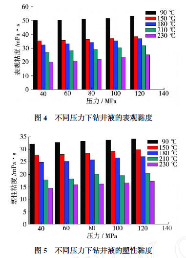 1) 在一定溫度下,隨著壓力的增大,鉆井液的表觀黏度與塑性黏度總體上均呈上升趨勢,而動切力的變化規律不明顯;