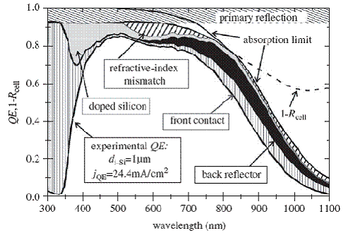 圖1 在織構(gòu)ZnO表面沉積單結(jié)微晶硅薄膜太陽(yáng)能電池(本征層厚度為1微米)的QE、吸收1-Rcell以及影響電池吸收的因素