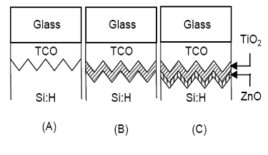 圖4. 標(biāo)準(zhǔn)電池與減反層電池的結(jié)構(gòu);(A):一般電池結(jié)構(gòu),(B):帶有TiO2減反層的電池結(jié)構(gòu),(C)帶有TiO2-ZnO的電池結(jié)構(gòu)示意圖