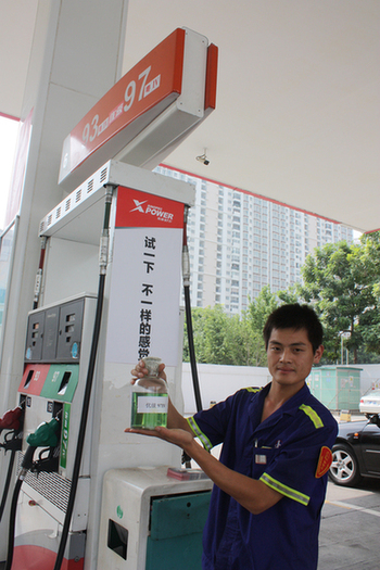 加油站的加油島上有個(gè)裝著綠色液體的瓶子,上面還貼著“優(yōu)級(jí)97號(hào)”字樣的標(biāo)簽。在詢(xún)問(wèn)了加油員之后他才知道,從10月20日起,中國(guó)石化在深圳110座自營(yíng)油站率先推出優(yōu)級(jí)97號(hào)汽油。