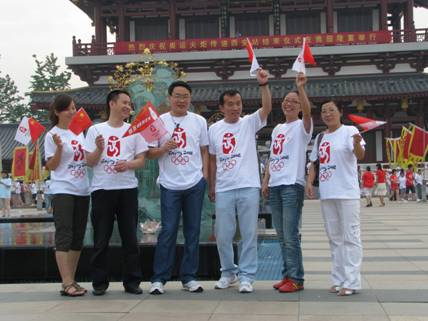 7月3日晚,很早就接到通知叫第二天早上早點去,因為有交通管制。所有參與此次活動的陜西振威員工5點就起床,乘座出租車,后經幾經周轉,終于到了大唐芙蓉園西門(此次火炬傳遞的終點)。沿途看到很多穿著奧運T恤的男男女女,老老少少,很多小孩騎在爸爸肩上貼著紅旗,熱鬧非凡。整個現場紅旗招展,鑼鼓喧天,人山人海。