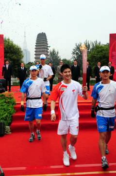 2008年7月4日上午8時13分,北京奧運會圣火開始在千年古城西安傳遞。208名火炬手將高舉“祥云”火炬,心手相傳,在中華文化的發源地——“自古帝王州”的古城西安傳承全人類共有的“更快、更高、更強”的奧林匹克夢想,傳遞西安人民的熱情。