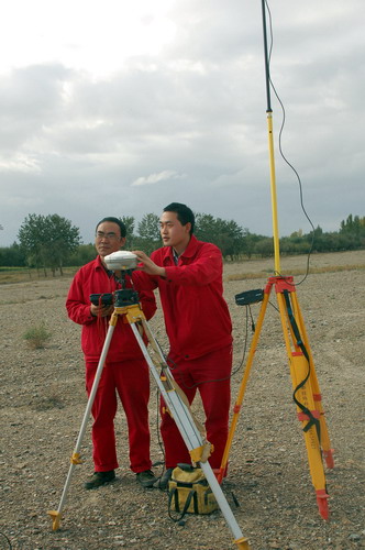 圖為測量人員正在戈壁灘上進行測量作業