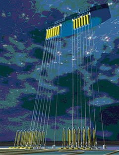 Example of a deepwater riser system, grouped single line offset riser. (Images courtesy of 2H Offshore Inc.)