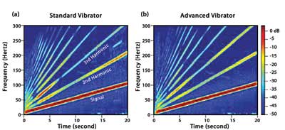 During engineering acceptance testing, the advanced vibrator system generated highly synchronous sweeps exhibiting bandwidth frequencies ranging from 1 to 250 Hz; the vibrator also maintained high force output from 4 to 160 Hz while reducing harmonic distortion of the signal by as much as 50%. Most sweeps with conventional vibrators begin at 5 Hz or higher; most conventional seismic vibrators can maintain a stable ground-force output to a maximum frequency of less than 100 Hz. Harmonic distortions can create false return signals that can mask authentic reflection events.