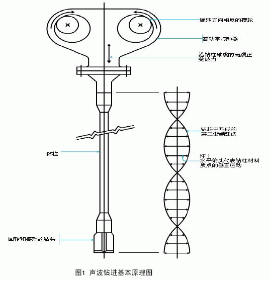 聲波鉆進的主要設備是振動頭,也就是振動器。振動頭能夠產生可以調節的高頻振動和低速回轉作用,再加上向下的壓力,使鉆柱和環形鉆頭不斷向巖土中推進。振動頭產生的振動頻率通常為50-185Hz,轉速100-200rpm。鉆柱的低速回轉保證能量和磨損平均分配到鉆頭的工作面上。當振動與鉆柱的自然諧振頻率疊合時,就會產生共振。此時鉆柱的作用就像飛輪或彈簧一樣,把極大的能量直接傳遞給鉆頭。高頻振動作用使鉆頭的切刃以切削、剪切、斷裂的方式排開其鉆進路徑上的物質,甚至還會引起周圍土粒液化,讓鉆進變得非常容易。