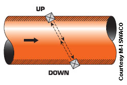 The meter employs ultrasonic sensors which utilize the principle of Doppler shift for velocity measurements. An average velocity is calculated, which the meter then multiplies by the physical dimensions of the flow cell to determine a volumetric flow rate. Molecular weight and mass flow rate can also be calculated, using the pressure and temperature measurements obtained from the meter.