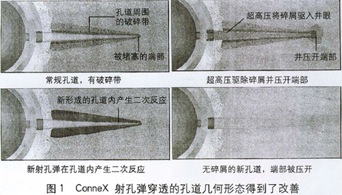 反應藥型罩概念是Connex射孔技術的基礎,它改變了常規射孔彈的制造和點火后的反應方式。ConneX射孔技術采用了在一定條件下壓制而成的雙金屬藥型罩材料,金屬藥型罩內的雙金屬組合在巨大的爆炸壓力下產生強烈的放熱反應,這種反應在孔道形成的數毫秒內發生,釋放的能量使孔道附近的壓力增加,產生向井內的涌流,將碎屑從整個孔道(包括非滲透的破碎帶)清除,使流動通道得到優化并接近理想狀況,最終實現清潔孔道、提高導流能力的目標。因此,這種射孔技術也被稱為自清潔射孔技術。