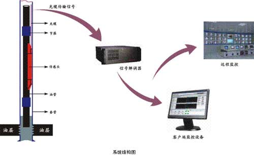 蔚藍仕Anbo光纖永久式井下溫度壓力監測系統由光纖傳感器,光纜,解調器三大部分組成。Anbo光纖永久式井下溫度壓力監測系統可以同時對一口或多口油井中不同深度的油層進行溫度和壓力的實時測量并能將測量數據進行永久保存。系統結構如下: