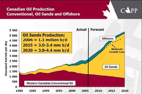 目前為止,“落基山能源走廊”中的最令人歡欣鼓舞的就是對加拿大阿爾伯達省油砂資源的開發。油砂作為北美地區新興能源的標志,主要集中在加拿大的阿爾伯達省,儲量達到1.7萬億~2.5萬億桶,其中1750億桶為可采儲量。這些資源將使加拿大一躍成為石油儲量僅次于沙特的國家。經過半個世紀的探索和研究,油砂的開發與提煉技術已經相當成熟,開發成本也已降至20美圓/桶,這在當前的國際油價已飆升至100美圓/桶的形勢下顯示出很強的經濟性!許多大型油砂項目紛紛上馬,相應的改質廠、煉廠和管道設施建設蒸蒸日上。加拿大石油生產協會預計從油砂瀝青中提取合成原油的產量將從2006年的110萬桶/日提高到2020年的400萬桶/日。盡管人口和經濟活動只占全加拿大的十分之一,但是阿省的各項經濟增長指標都位列全加拿大的前茅(2006年7%,2007年預計為5%)。道明銀行的報告中說,加元的走勢也得益于資源的開發,加元兌美圓匯率已經從2002年的0.62漲到了現在的0.96,是距上一次70年代的石油大開發以來的最高峰。美國的油砂儲量在600~800億桶,其中三分之一在猶他州,但從在技術上講,開發難度要高過加拿大的油砂。