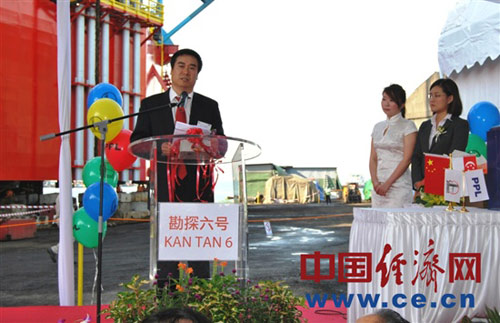 中國石化股份公司高級副總裁蔡希有在“上海海洋石油局‘勘探六號’自升式鉆井平臺下水儀式”上發表講話。