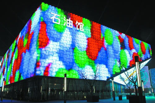 石油館的建筑外形為規則的長方體和不規則的LED高清顯示結構結合體,外表裝飾為象征著輸油管道的管狀編織圖案,具有鮮明的石油石化行業特色。