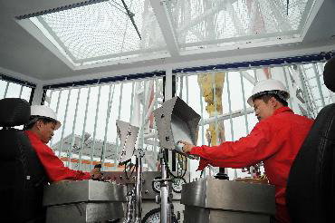 宏華公司的鉆機操作員在調試交流變頻數控電驅動鉆機(5月20日攝)。