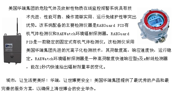 上海市為我國內地人口密度最高的城市,在全球反恐的國際大形式下,世博會的舉辦對于上海的安全保衛措施提出新的挑戰,需要在全市廣泛配設危險品檢測設備,預防恐怖襲擊。華瑞科力恒提供了危險氣體及放射性物質在線監控報警系統,以保障世博會的順利舉行。