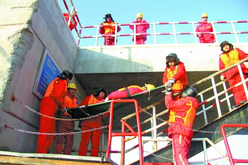 圖為演練人員把傷員平行轉(zhuǎn)移上岸。記者 朱米福 攝 春寒料峭,波濤滾滾。2月25日16時,冀東油田志達公司舉行了一場惡劣天氣海上救助...