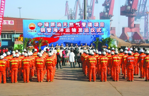 3月10日,中國石油技術(shù)開發(fā)公司向中緬原油天然氣管道項目供應(yīng)的鋼管,在天津港務(wù)局五公司東突堤碼頭通過海洋運輸正式發(fā)運。