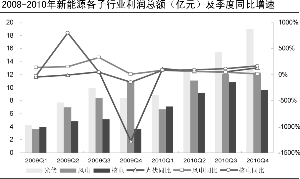 根據統計,光伏類公司在2010年四個季度的主營業務收入仍然延續超預期增長,實現主營收入總額386億元,季度同比增長均超過60%;實現利潤總額56億元,季度同比增長接近90%。風電類公司則出現疲態,雖然年均增長仍維持50%的水平,但三、四季度的收入和利潤的同比快速下滑,顯示行業可能已經跨過了行業的高速增長期,步入相對低速的增長軌跡。核電類公司在過去一年的業績表現呈現出前高后低,但總的來說,增長速度要明顯快于2009年。而利潤總額在2009年第二季度的非正常增長主要是由于東方電氣(600875,股吧)在2008年受地震影響帶來的數據異常。