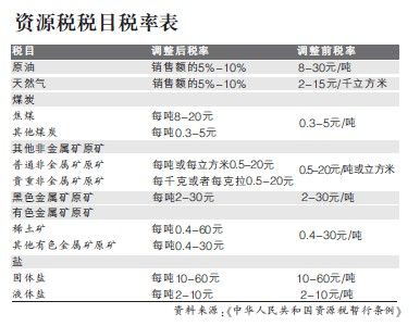 10月10日,中國政府網刊登修改后的《中華人民共和國資源稅暫行條例》(下稱《暫行條例》),石油、天然氣資源稅由“從量定額”改為“從價定率”計征,在全國推廣;與之前新疆改革試點稅率一致,稅率為銷售額的5%-10%。煤炭等其他品目則延用從量定額計征方式,不做調整。