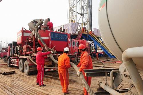 中原油田固井工程處正在濮深18-側1井進行完井固井施工
