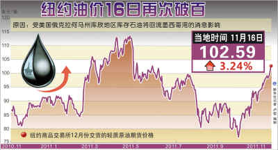 11月16日,紐約商品交易所12月交割的輕質原油期貨價格沖破百元大關,收于每桶102.59美元,漲3.24%。當日,12月交割的倫敦北海