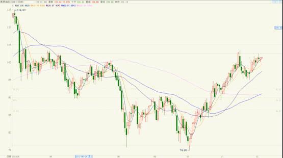 國際油價也順利站到半年線及月線上方。從圖形來看,短期油價繼續看多,紐約原油將試探上沖不久前高點102.5點。能夠突破在上方繼續形成高點還是轉為向下形成雙頂主要看消息面走向。