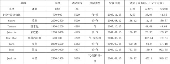 表3 2000-2008年巴西海上重大油氣發(fā)現(xiàn)(大于10億桶油當(dāng)量)