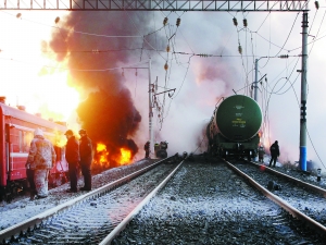 報(bào)道說,當(dāng)?shù)貢r(shí)間31日5時(shí)30分,這列共掛有68節(jié)車廂的運(yùn)油車在距離阿穆爾州布列亞車站6公里處發(fā)生事故,17節(jié)車廂出軌,13個(gè)油罐傾覆起火。初步估計(jì)事故造成100至200噸石油溢出。