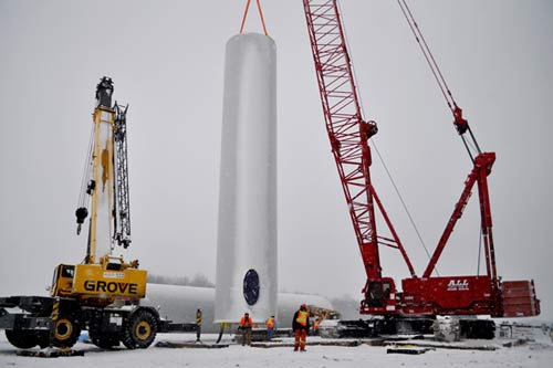 截至1月14日,龍源加拿大10萬千瓦風電項目風機基礎施工已經過半,塔筒吊裝也陸續開始,工程建設有序推進,預計今年全部投產發電。圖為項目建設現場。