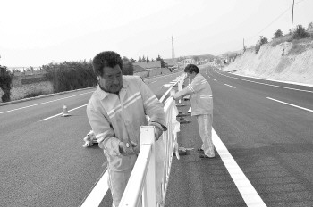 19日上午,在萊山區(qū)萊源路南延公路上,8名萊山公路局的工人正在加緊安裝中央隔離護欄。這批由“搪瓷”技術結合“太陽能自發(fā)光”柱帽的護欄,港城首次引入,目前,全部安裝工程已完成約70%,預計本周內(nèi)完工。
