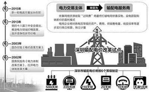 2015年1月,深圳啟動輸配電價改革試點,全國電力市場化改革又邁出重要一步。隨著輸配電價改革的推進,我國將逐步推進銷售電價市場化改革,逐步增加電力用戶選擇權,同時將一次能源價格變化信號及時傳導至銷售電價,使價格信號合理反映市場供求、資源稀缺和環境損害成本——2015年1月1日,深圳市如期啟動輸配電價改革試點,將現行電網企業依靠購、售電獲取差價的盈利模式,改為對電網企業按有效資產實行總收入監管,公布獨立的輸配電價。