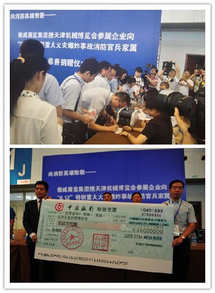 在展會閉幕當天(8月21日),振威攜參展的知名展商,為遇難消防官兵的家屬舉行了個現場募捐活動。開發區、市內的相關領導也對此表示高度的支持。天津市商委,天津市會展研究會,濱海新區慈善總會領導均親臨近現場。大族激光科技股份有限公司,臺灣普慧企業股份有限公司上海普盈貿易有限公司等企業積極捐款。相應的款項將由天津公證處現場公證,并全部交由天津開發區慈善協會進行后續妥善安排。