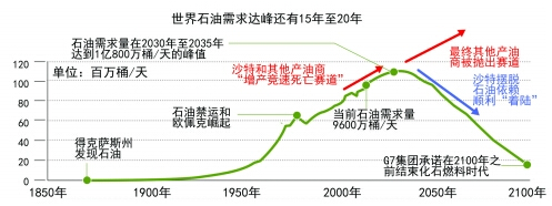 據(jù)伯恩斯坦的世界石油消費(fèi)預(yù)測(cè)顯示,到2035年左右,全球石油絕對(duì)消費(fèi)量將到達(dá)峰值。這意味著,屆時(shí),滿足世界能源新增需求將由石油替代品來承擔(dān)。石油在經(jīng)濟(jì)、環(huán)境、技術(shù)等綜合成本作用下,需求將逐漸下降。這是能源更迭的必然趨勢(shì)。而沙特提出的“2030轉(zhuǎn)型愿景”與石油消費(fèi)達(dá)峰趨勢(shì)幾乎不謀而合。這表明,海灣產(chǎn)油國(guó)正在抓住石油緩慢增長(zhǎng)的最后20多年,應(yīng)對(duì)石油式微的能源新格局。換句話說,石油在世界能源消費(fèi)結(jié)構(gòu)中的穩(wěn)中趨降,這一根本轉(zhuǎn)變推動(dòng)了產(chǎn)油國(guó)逐漸弱化石油經(jīng)濟(jì)支柱的選擇。