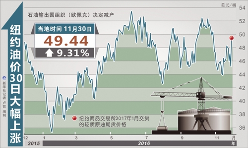 受歐佩克減產(chǎn)協(xié)議提振,國際原油市場(chǎng)出現(xiàn)了強(qiáng)勁反彈。截至當(dāng)天收盤,紐約商品交易所2017年1月交貨的輕質(zhì)原油期貨價(jià)格上漲4.21美元,收于每桶49.44美元,漲幅為9.31%。2017年1月交貨的倫敦布倫特原油期貨價(jià)格上漲4.09美元,收于每桶50.47美元,漲幅為8.82%。分析人士認(rèn)為,歐佩克減產(chǎn)的重要意義,除了實(shí)際減少產(chǎn)量之外,更重要的是歐佩克為國際原油市場(chǎng)明確了未來一段時(shí)間的走勢(shì)。
