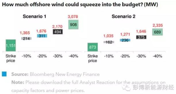 如果海上風電能夠吞下整個預算,且投標者均大膽出價(低于執(zhí)行價格40%),海上風電技術有可能拿下3GW多一點容量(情景一)。但如果燃料發(fā)電技術拿到了最大份額,且沒有開發(fā)商的出價低于執(zhí)行價格,那大約僅有873MW的海上風電容量有機會拿到預算(情景二)。
