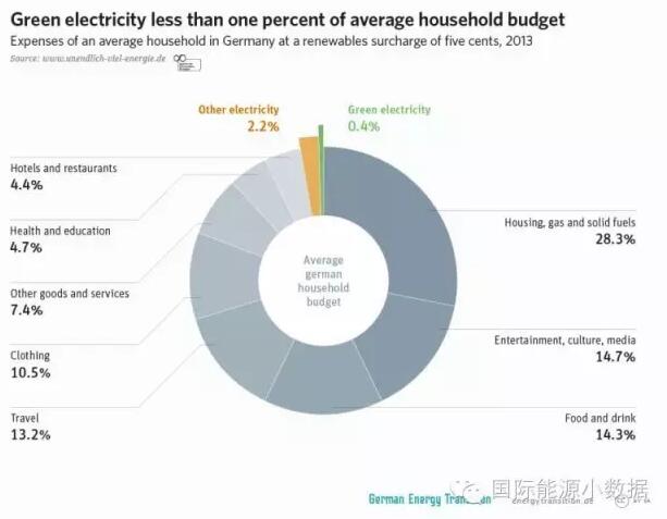那么,為什么德國百姓承擔高昂電費情況下卻依然對能源轉(zhuǎn)型給予支持呢?原來,從德國家庭平均支出構(gòu)成來看,雖然說電價因為可再生能源附加費而變得更貴了,但是德國人收入較高,可再生能源加價僅占家庭支出的0.4%。相比其他開支,比如娛樂14.7%、旅行13.2%,綠色電力這0.4%值了。