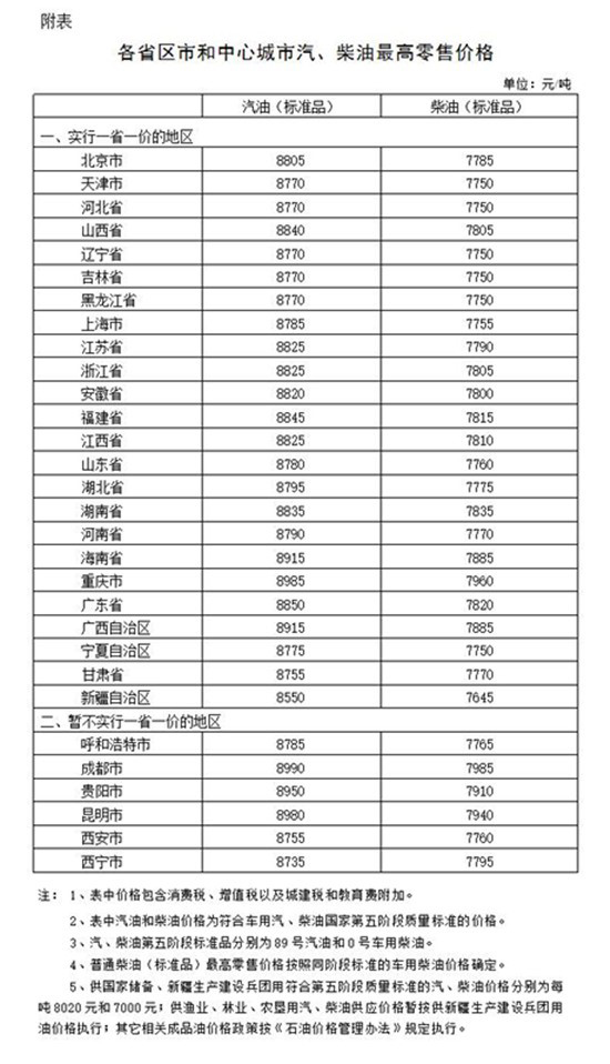 附:調整后各省區市和中心城市汽、柴油最高零售價格