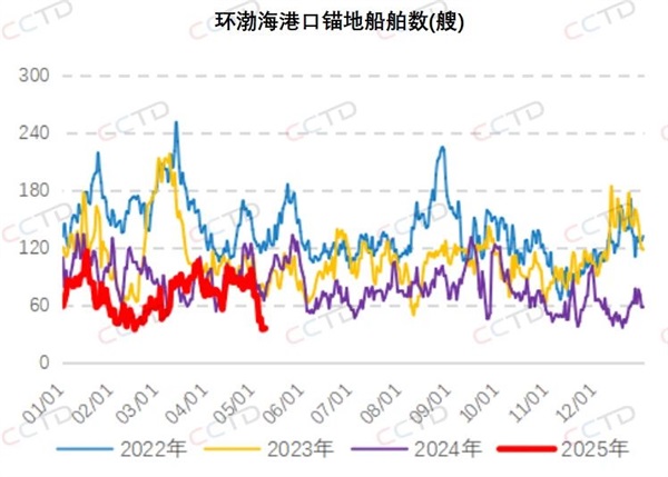 五一期間,受下游工業生產活躍度下降影響,疊加假期后半程南方地區迎來降雨,沿海電廠日耗水平持續低位,在庫存高位、長協煤供應穩定的雙重因素作用下,下游需求釋放顯著不足。收假歸來,環渤海港口錨地船舶數量降至40條以下,預到船舶也不到30條,創下近年同期最差紀錄,曹妃甸、京唐港部分港口出現空泊現象。